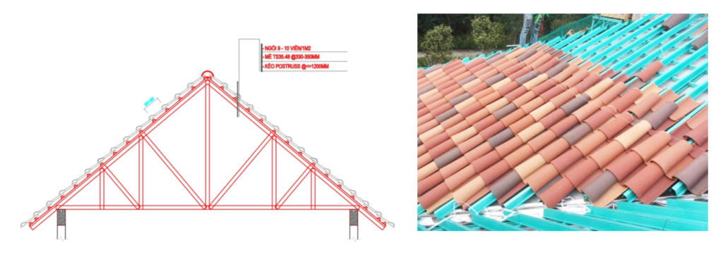 Hệ vì kèo thép mạ kẽm 2 lớp Poshaco được tạo thành bởi vì kèo C75.75 hình chử A và thanh mè TS35.48 để lợp ngói.