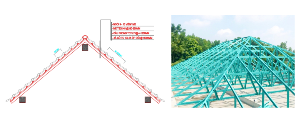 Phần lợp ngói sẽ được bắt đòn tay (li tô) TS 40.48 theo các tiêu chuẩn ngói lợp (Khoảng 320mm – 370mm).